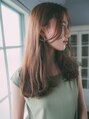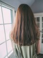 全体に重ためにカットされたロングスタイルです。前髪はリバースにながれるようになっているので顔まわりはそこまで重たく見えないようになっています。カラーリングはツヤ感がでやすいナチュラルなブラウン系です。