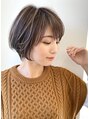 ひし形シルエットの大人かわいいハンサムショートボブ。艶カラーの大人ボブ。前髪はセンターパートで小顔に。透け感をプラス。はちうえの量が膨らまない様に量を間引いて骨格に合わせた似合わせカット。簡単スタイリングヘア。艶カラー、ハイトーンカラー