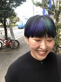 切り込んだマッシュにパープルとグリーンをバイカラーに配置したデザイン性のあるショートスタイルです。色味をお好みで変えても可愛いです