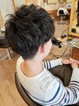 ツーブロック、ネープはフェード。トップに長さを残してパーマをオン。スタイリングしやすいヘアスタイルです。