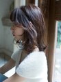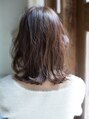 微妙な長さでまとまりにくいミディアムスタイルは外ハネにしてゆるめのウェーブを出すことでまとまりが出てふんわりとしたかわいいシルエットを出すことができます。地毛よりも少し明るめのブラウンで落ち着かせて大人っぽい印象に。【稲毛】