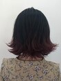 前下がりパッツンボブに、ブリーチで、グラデーションベースを作り、ボルドー系の可愛い色素をプラスした、光の浴び方により表情を変えてくれる、万能ボブスタイルです。前髪から全てのカットがつながっているので分け目は気分によって変える事ができます。