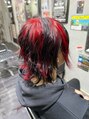 もともと髪色が明るい方でしたので、黒部分は根元そのまま、赤部分のみブリーチリタッチしたのちに、赤と黒のメッシュにしました。外ハネウェーブスタイルに仕上げました!