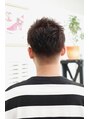 サイド、襟足を3ミリで刈り上げの今はやりの2ブロックスタイル。ワックスやグリースで立ち上げて完成。