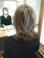 ベースカットはボブに切る事で艶っぽい面を出しつつ、表面はレイヤーを入れて動きを表現。トータルで見た時にミディアムスタイル見えるように工夫を凝らした造形にカットしています。ヘアカラーはオリーブグレイに細かくたっぷりのハイライトを施しました。