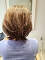 ハネても良いように軽さを出し、トップは頭の形がキレイに見えるようなシルエットにしました。カラー根元を暗めにしたグラデーションカラー。肌に合わせたブルー系のグレージュにしました。