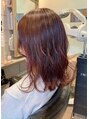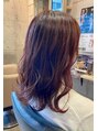 鎖骨下くらいの長さでゆるく巻いたスタイルです。ピンク系のカラーで可愛さもある印象です。