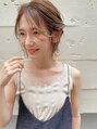 シースルーバング、ボブスタイルのハーフアップアレンジです。濡れ髪 レイヤーミディアム オレンジブラウン 外ハネミディアム グラボブ ニュアンスカラー カーリー 切りっぱなし シースルーカラー