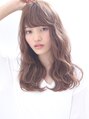 重めの斜めバングとくせ毛風カールでゆるふわ質感に仕上げた愛されロングレイヤー。ベージュカラーをオンして顔周りを明るく仕上げました。毛先カラーやニュアンスカラーで動きを付けても抜け感が出てGOOD。アシンメトリーなヘアアレンジもオシャレ感UP