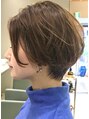 フラットめの少し前下がりのショートボブです。少し前下がりにする事で顔をシャープに見せる効果があります。耳掛けして2wayでお楽しみ頂ける飽きないスタイルになっています。