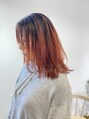ケアブリーチでバレイヤージュのベースをつくり、そこにオレンジカラーをオン!カットは切りっぱなしに表面のみにレイヤーを入れたスタイル。