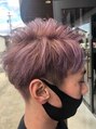 アップバングと束感がある軽さのあるメンズのショートスタイル。ブリーチしたベースにピンクベースのシルバーで柔らかさを出したスタイル。かわいすぎず大人っぽさが感じられるメンズにも合うカラーです。