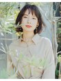 不動の人気のぱつっとしたあごラインのミニボブスタイルです。首が細く長く見える位置で、自然に内に入る様にカットしました。カラーはハイトーンのベージュで根元はあえて地毛を生かして、抜け感が出るようにしました。スタイ