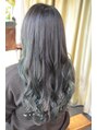ダブルカラーで黒髪を生かしたデザインカラーをしました!グリーンをメインに2色いれてます!根元が伸びてきても気になりずらいのがグラデーションカラーのいいところです!