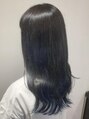 全体的に艶と透明感のあるダークグレージュに毛先にネイビーのカラーでお洒落度UP 毛先外ハネでゆるく巻くのが◎