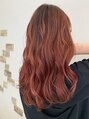 根元から毛先までブリーチして発色がいい、レッド系カラーにしました。ブリーチは一回です。色が抜けやすい色になっているので濃く毛髪に入れています。最後の仕上げはスタイリング剤オイルをつけて32mのコテで巻いています。