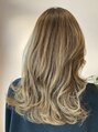 ハイライトを全体に入れてからミルクティーベージュでヌーディーな艶感を出しました。カットは顔まわりにアクセントをつけて柔らかな曲線を意識しました。