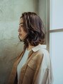 中間から毛先に少し強めのカールを出したミディアムスタイルです。スタイリング剤はオイルを使用し、程よいウエット感と束感を出しています。ノーバングで流れるようにつくり、落ち着きのあるダークブラウンカラーで大人スタイルに仕上げました
