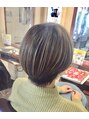 明るめカラー剤にブリーチを少し混ぜて派手すぎないハイライトにベースははマットアッシュで透明感をカットは丸みのあるショートボブ
