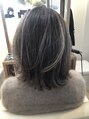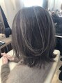 表面のコントラストしっかりめのハイライトをいかしたレイヤーミディアムボブ。巻き方やアレンジによって色々なシルエットを楽しめます。緑味に寄らないベージュベースのグレーカラーで肌ツヤUP