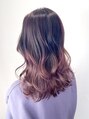 毛先のブリーチと表面にハイライトを入れてあるベースにピンクブラウンのカラーで染めています。