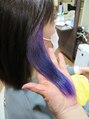 耳にかけた時に見えるようにしたいというご要望だったので、幅広めで根元ギリから攻めて色味を出しました。ブリーチした上にカラーミューズの紫を入れ、ビビットな色味が出ました。