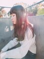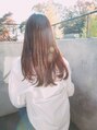 前髪を広めでゆるやかなラウンドにカットしたロングスタイル。 柔らかい印象に仕上がるようになっています。カラーは少し赤みのあるブラウンでツヤ感があります!毛先をワンカール入れるだけでまた柔らかくなります!