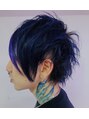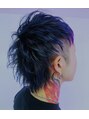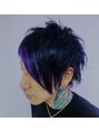 ブルーアッシュ仕上げのフロントに大胆なヴァイオレットが映えるアシメショート!!前後のメリハリが気持ちいいねっ!!(伸ばしかけの根本を誤魔化すのにもおすすめ)