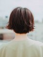 前髪なしのショートボブスタイルです。頭の形が良く見えるよう、やや丸みのある高さのウエイトを作ります。カラーはツヤ感と品の出るブラウン系カラーです。毛先に動きが出るようストレートアイロンで動きをつけてスタイリング剤をくしゅくしゅと。【船橋】