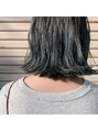 カットは肩につくかつかないくらいのボブに。ブリーチ毛を伸ばしていく段階で毛先に深いグリーンを。自然とグラデーションのような感じに。(ある程度の明るさが必要。)