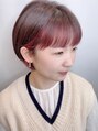 前髪、フェイスラインにインナーカラーを入れた耳かけ丸みショート。シンプルなショートカットにアクセントカラーを入れて個性を出しています。前髪のチェリーレッドカラーは色落ちすると薄いサーモンピンク系のお色になってくるので色落ち過程も楽しめます。