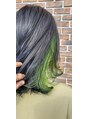 今回はインナーカラーに蛍光に近いグリーンをブリーチ後にon。メリハリをつけるため表面にかぶせる色は黒に...ただ黒だとつまらないので室内だと黒、外だと紺にみえるようブルーブラックにしてみました。