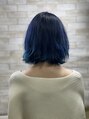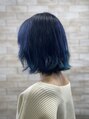 全体ケアブリーチしてから、根元から中間は暗めのネイビーブルーで、毛先はカラーバターでビビットなブルーのグラデーションカラーです。ブリーチしたカラーだけど明度が暗いので派手にならず落ち着いた大人カジュアルなグラデーションです。