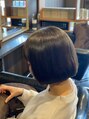 切りっぱなしの襟足ギリギリのボブ。ブルーアッシュで落ち着いたカラー。