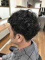 低めの刈り上げにツーブロック。パーマスタイルでオシャレパパに。
