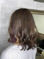 顔周りはフェイスフレーミングで明るめのアッシュブラウンに、イヤリングカラーは鮮やかなラベンダーを両サイドに入れています。全体カラーはハイライト状にナチュラルブラウンを入れて、伸びてきても気になりにくいスタイルにしたい方にオススメです。