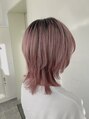 カットはミディアムヘアのマッシュウルフ。カラーは伸びてきた根元の黒を残して薄めのホワイトピンクカラー。
