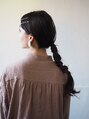 ローポニーのアレンジヘアです。バングはセンターパートにしてピンなどで止めるとGOOD!