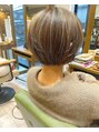 丸みのある前髪無しショートボブにハイライトがたっぷり入ったスタイルです