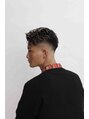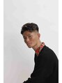 スキンフェードで刈り上げをつくり、前下がりのシルエットに!それを後ろに流す事でバランス良くなるようカット。パーマで大人な雰囲気を出し、ハイライトで遊び心を!