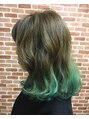 グリーングラデーションカラーです。毛先は1ブリーチ後にグリーンを塗布。トップはカラーのみでオリーブハイトーンカラー。