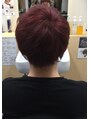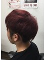 カットは、ツーブロ、後ろは刈り上げでトップはマッシュレイヤーにカット。カラーはブリーチを2回入れて、赤色を乗せます。