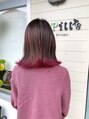 全体ピンクベージュに裾カラーは濃いめのピンク系。暖色系はお肌が明るく見えるのでおすすめです◎切りっぱなしカット、外ハネスタイルと合わせやすいです。