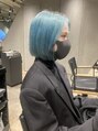 2回ブリーチでベースをしっかり作って、淡いペールブルーに。切りっぱなしのボブでモードさを出して、ペールカラーでさらに個性的に。