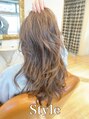 12-OC:サンライト:13スモーカートパーズ:5スモーキートパーズを1:1:1:20%で調合し、透明感のあるベージュにカラーしました。表面に5ミリ幅のハイライトブリーチを5枚程度入れて、立体感と透明感をプラス。20号前後の大きめパーマで動きのあるスタイルが◎