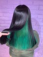 しばらく髪の毛を染めないとのことだったので、表面はブルーブラックでがっつり暗くしました。インナーは濃いめのグリーンで染めました。