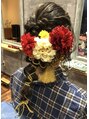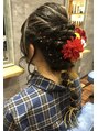 前からはすっきり見せたいとのご要望でしたので、後ろで可愛くふわ盛りしてローポニーに仕上げ毛先にはロープでまとめ、花飾りとその他の飾りを右後ろにまとめて左後ろは金箔を散らばせてお洒落に♪