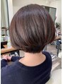 襟足すっきりとしたボブスタイルです。コロンとしたシルエットが女性らしい大人可愛いスタイルです。襟足ギリギリでカットしているスタイルなので首がスッと綺麗に見えます。毛先のほうにくにゃっとゆるめにニュアンスのパーマがかかっています。