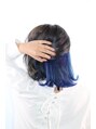 ケアブリーチで2回抜きました。ベースはグレーベージュカラー、インナーはブルーを入れたカラーリング。