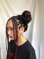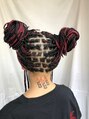 特殊エクステで細目ブレイズスタイルです。黒ベースにワインレッドメッシュをいれています。仕上げはツイン団子他アレンンジもかわいいです。